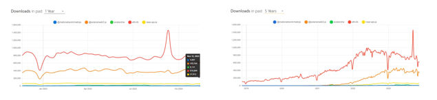 Last important aspect is to assess developer traction on Solana and other chains. We primarily rely on three sources - NPM weekly library downloads (as a proxy to developer interest), the number of developers, and the number of commits as reported by Electric Capital’s State of Developer report.