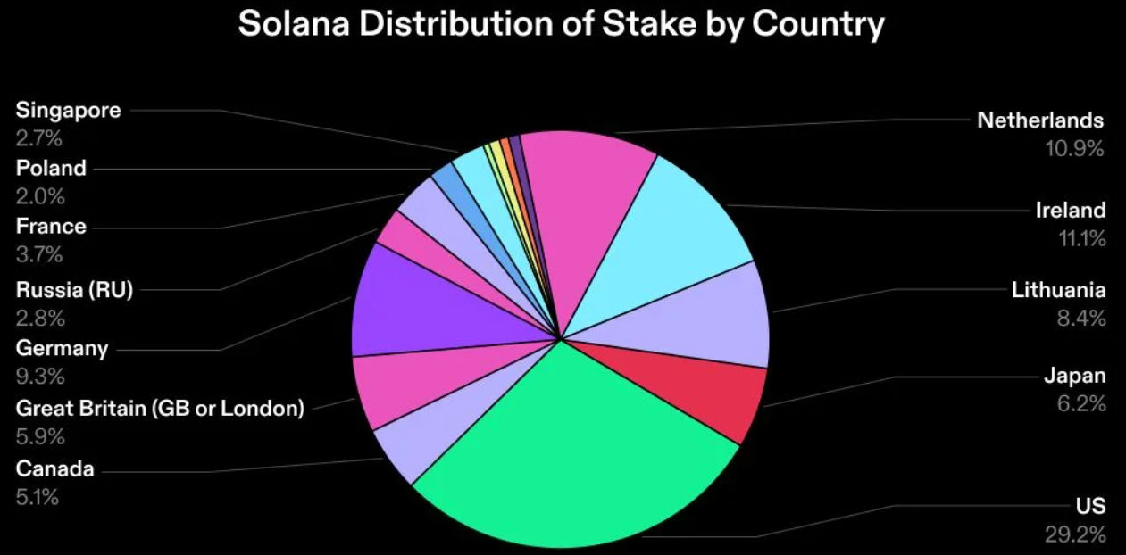 Solana's Nakamoto Coefficient (”NC”) remains robust at 31, signifying a decentralized network (note that Ethereum’s NC stands at 25 and Avalanches at 27). Stake distribution across data center providers and geographical regions demonstrates efforts to minimize risks and enhance resilience. The Foundation has publicly acknowledged the need for quality validators and plans to introduce initiatives to encourage node quality.