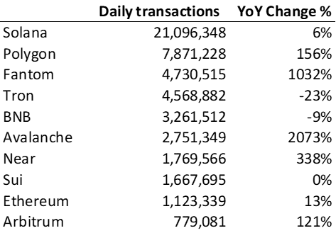 The chain currently processes over 21 million transactions (including voting transactions) per day, up 6.2% from a year ago (19.8 million), almost 3x the number of the second largest chain (by number of transactions) Polygon, which processes around 7.8 millions daily.