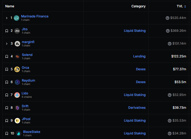 Largest protocols in terms of TVL continue to be liquid staking protocols with Marinade Finance leading the pack, followed by Jito. Lending protocols such as MarginFi ($142m) and Solend ($122m) are in close numbers 3 and 4 as reported by DefiLlama.