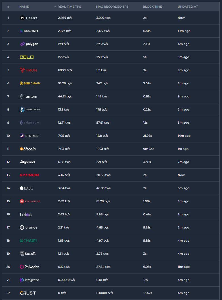 Solana continues to be one of the fastest blockchains, even across L2s, regularly achieving over 2,000 TPS (excluding vote transactions) with other major chains lagging in orders of magnitude. Closest EVM-based competitor, Polygon, processes around 179 TPS and L2s such as Arbitrum or Optimism process 13 TPS and 4 TPS, respectively. Ethereum processes around 12 TPS.