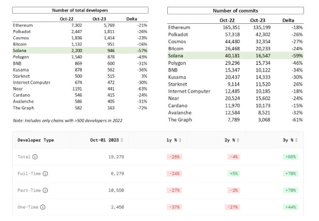 Unfortunately, Solana paints a different picture when we consider total number of developers and commits. The chain witnessed the second-largest decline in total developers among leading L1 blockchains, plunging from 2,200 to just 946 developers (-57%). On the number of commits (which are based on public Github repos), Solana has been performing even worse, falling from 40.1k in October 2022 to 16.5k in October 2023 (-59%). The decline is not surprising, considering the repercussions of the FTX collapse and the impact it had on teams - facing financial hardships due to locked funds at FTX and subsequently also SVB, or relying on Alameda for funding. It's crucial to acknowledge though that the overall market, measured by the number of developers, contracted by 28%.
